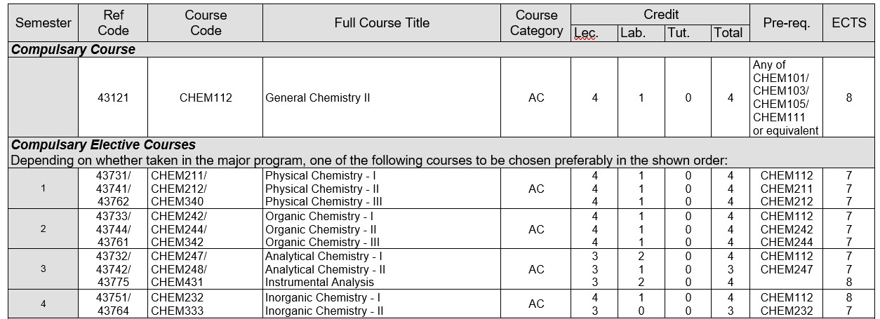18 krediyi (30 AKTS kredisi) tamamlayacak sayıda olması şartıyla, “CHEM” kodlu derslerden oluşmaktaktadır. Seçmeli dersler, Yandal Program Danışmanı tarafından ve mevcut olan dersler arasından, öğrencinin ilgi alanlarına göre seçilmektedir.
